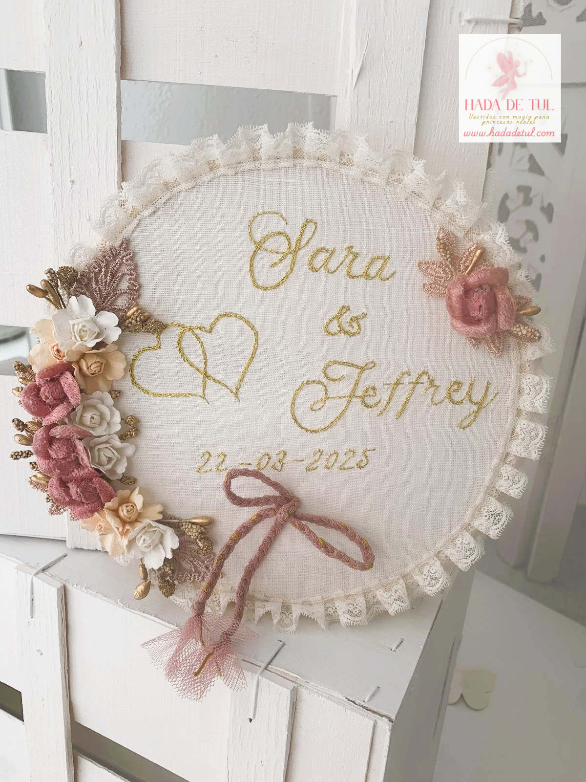 Porta alianzas con bordado sobre lino y puntilla alrededor y detalle floral.