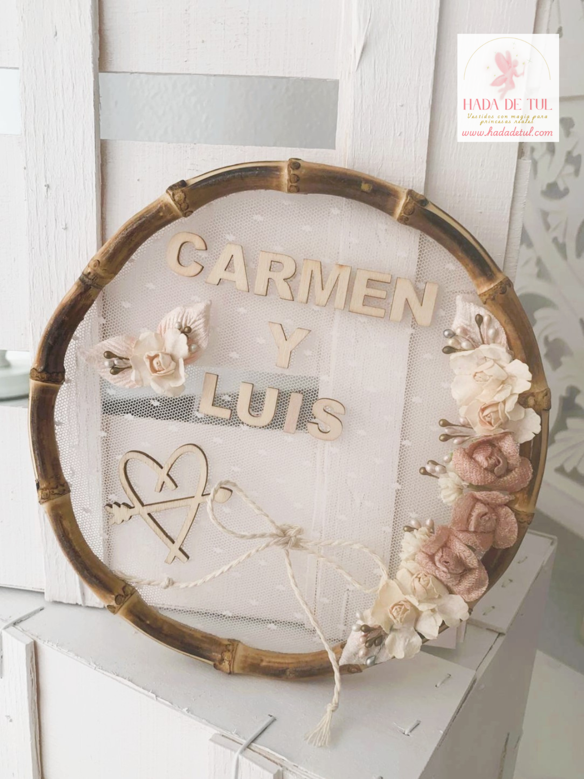 Porta alianzas con fondo de tul y madera, con detalle floral.