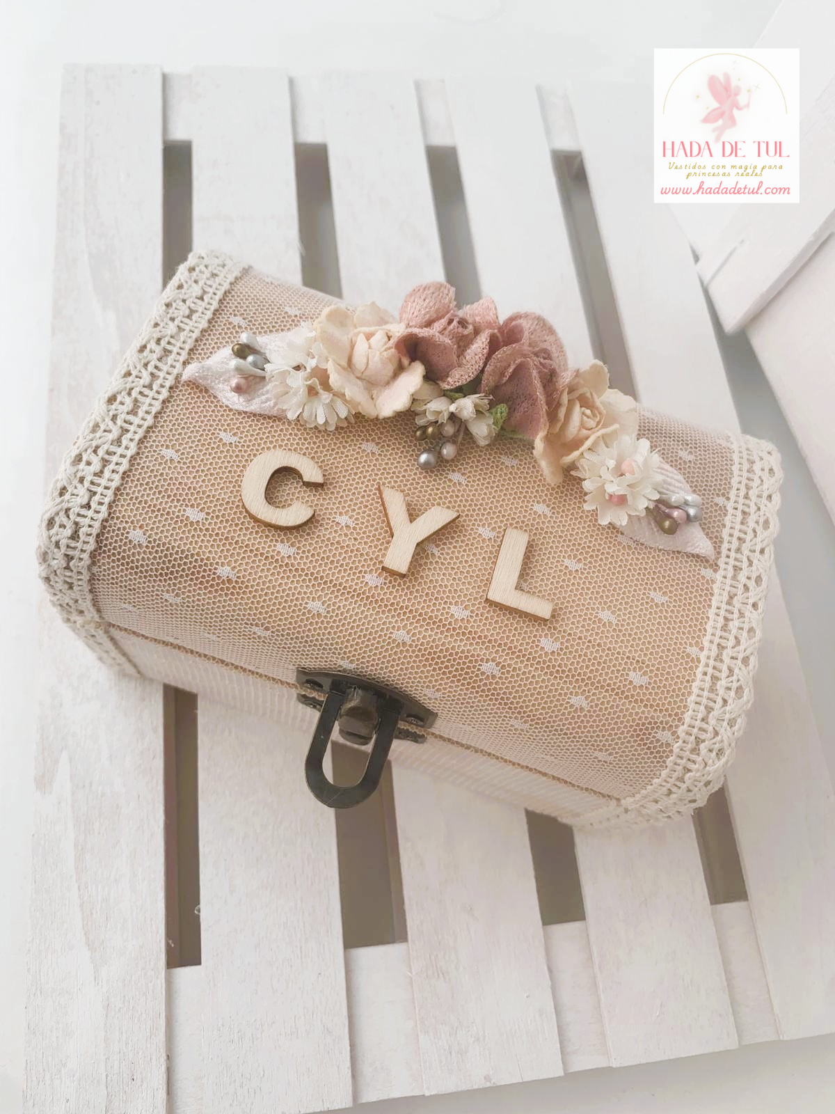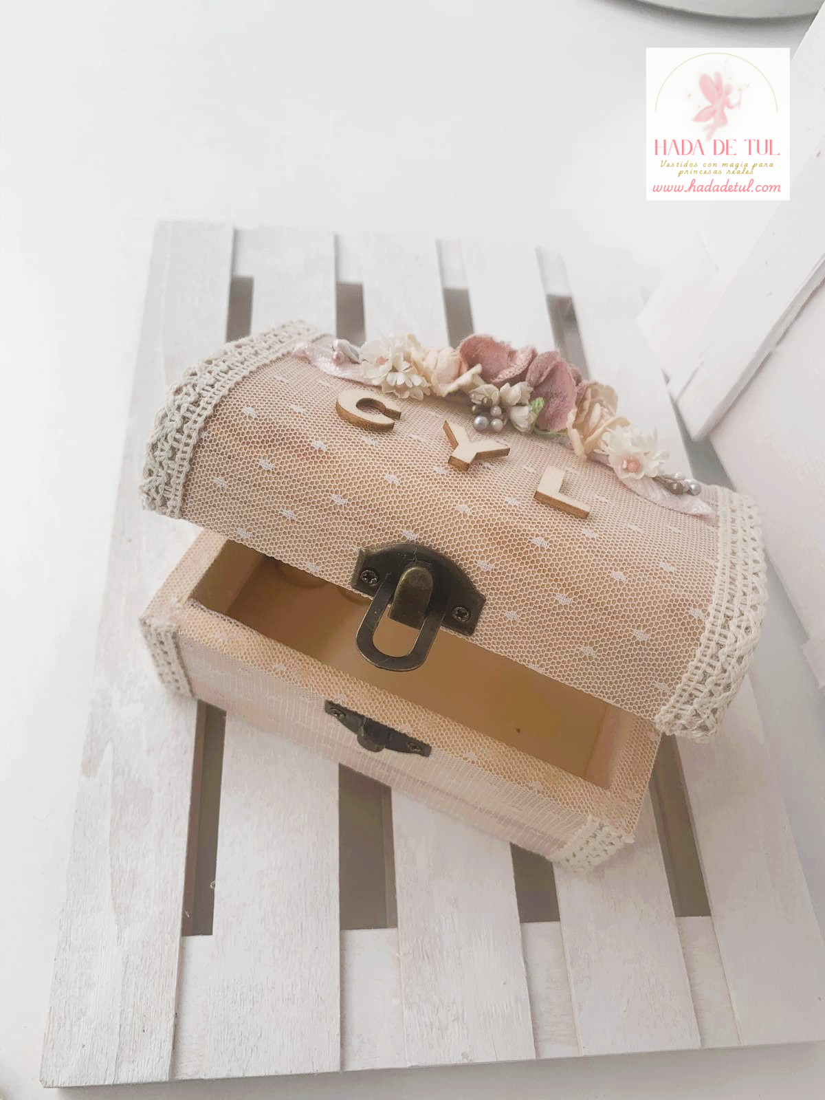 Cofre de madera para las arras, forrado con tul y detalle floral.