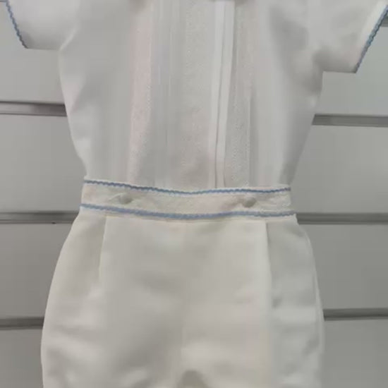 El conjunto Noé para bebés hasta 18 meses incluye pantalón y camisa a juego en blanco, realzado con un delicado ribete azul celeste. La camisa presenta una puntilla fina en el cuerpo, mientras que el pantalón incorpora este mismo detalle en la cintura, aportando elegancia y armonía al conjunto. Perfecto para bautizos y celebraciones especiales, combina comodidad y estilo para vestir a los más pequeños con distinción.