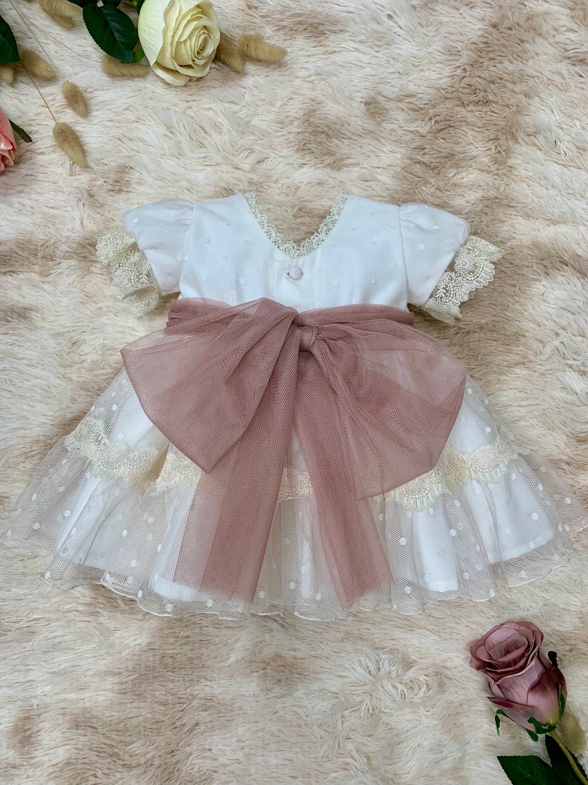 Vestido de tul de plumetis con un ligero toque de color, y puntillas bordadas. Fajín y lazada color pastel, disponible 2 colores más.